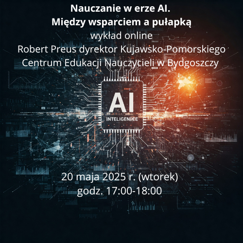 Wykład online: Nauczanie w erze AI. Między wsparciem a pułapką. Wydarzenie odbędzie się na platformie Microsoft Teams 20 maja 2025 r. (wtorek), godz. 17:00-18:00. Wykład wygłosi Robert Preus dyrektor Kujawsko-Pomorskiego Centrum Edukacji Nauczycieli w Bydgoszczy.