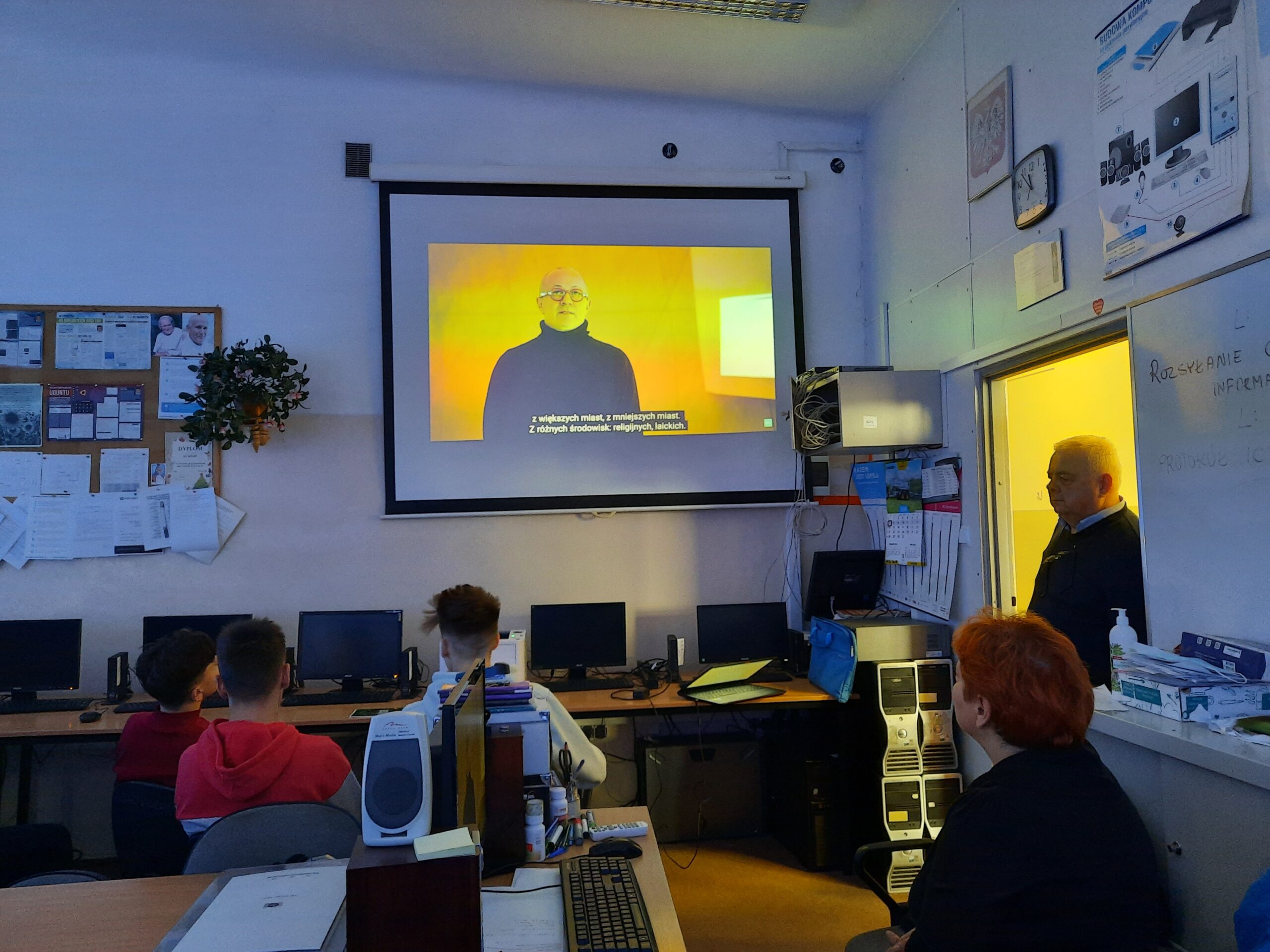 klasa w szkole. Na środku ekran rzutnika. Wyświetlany jest film.
