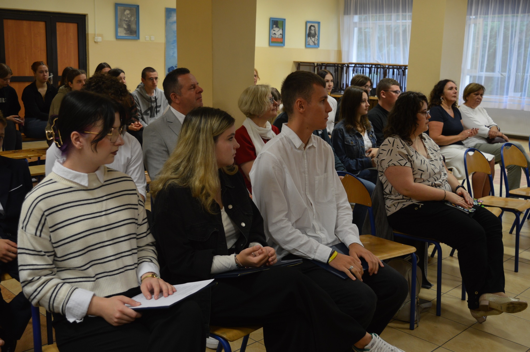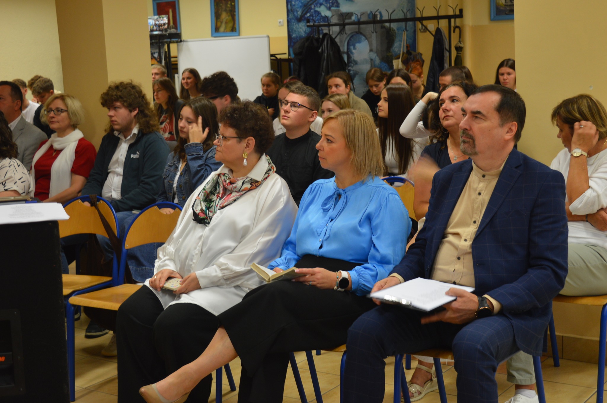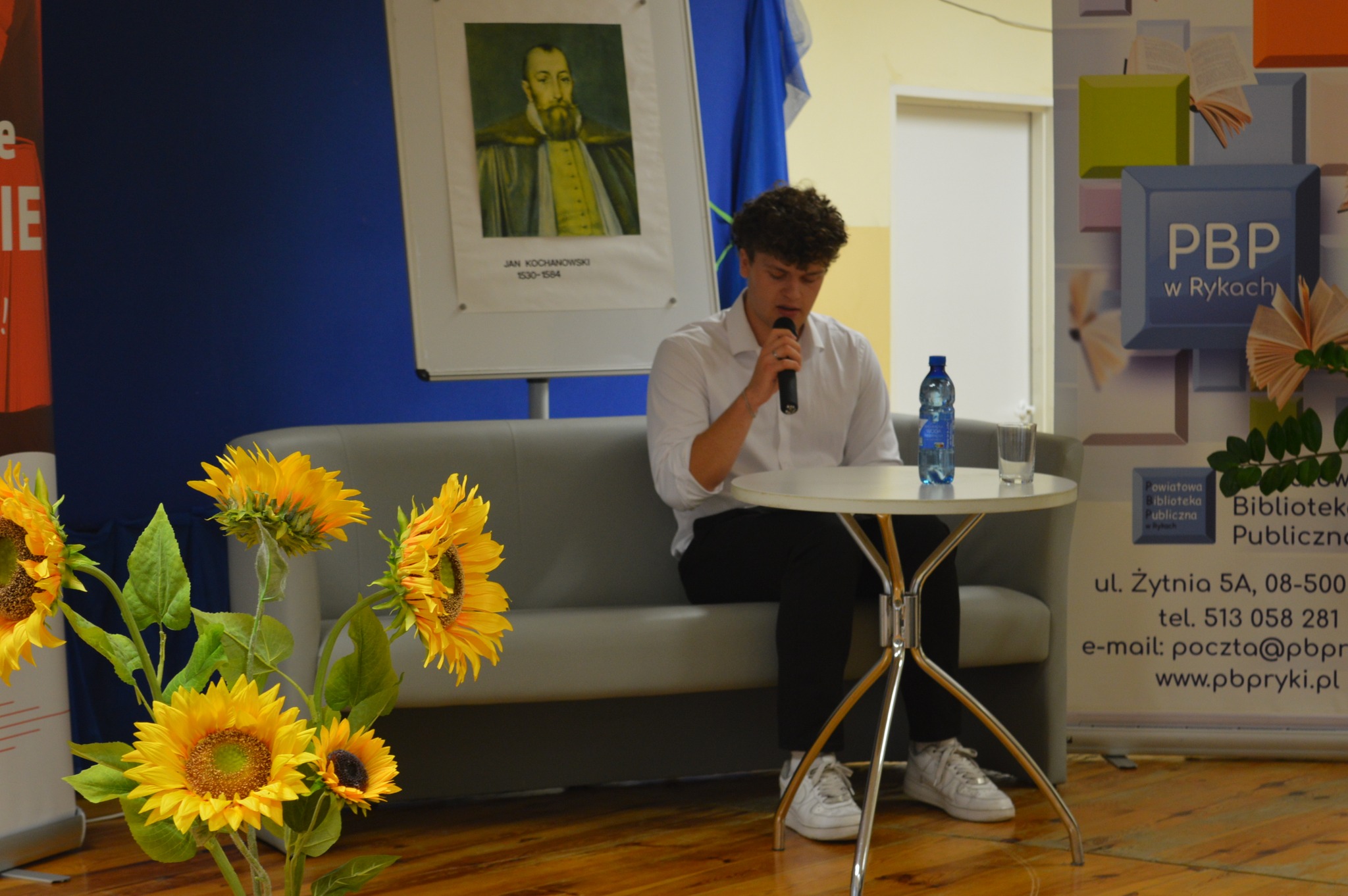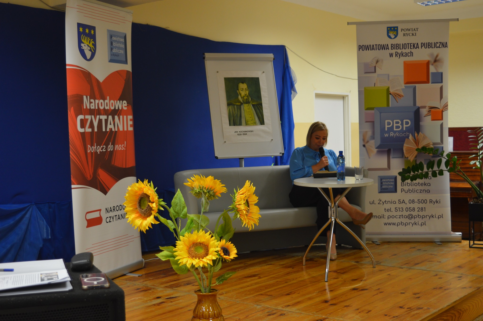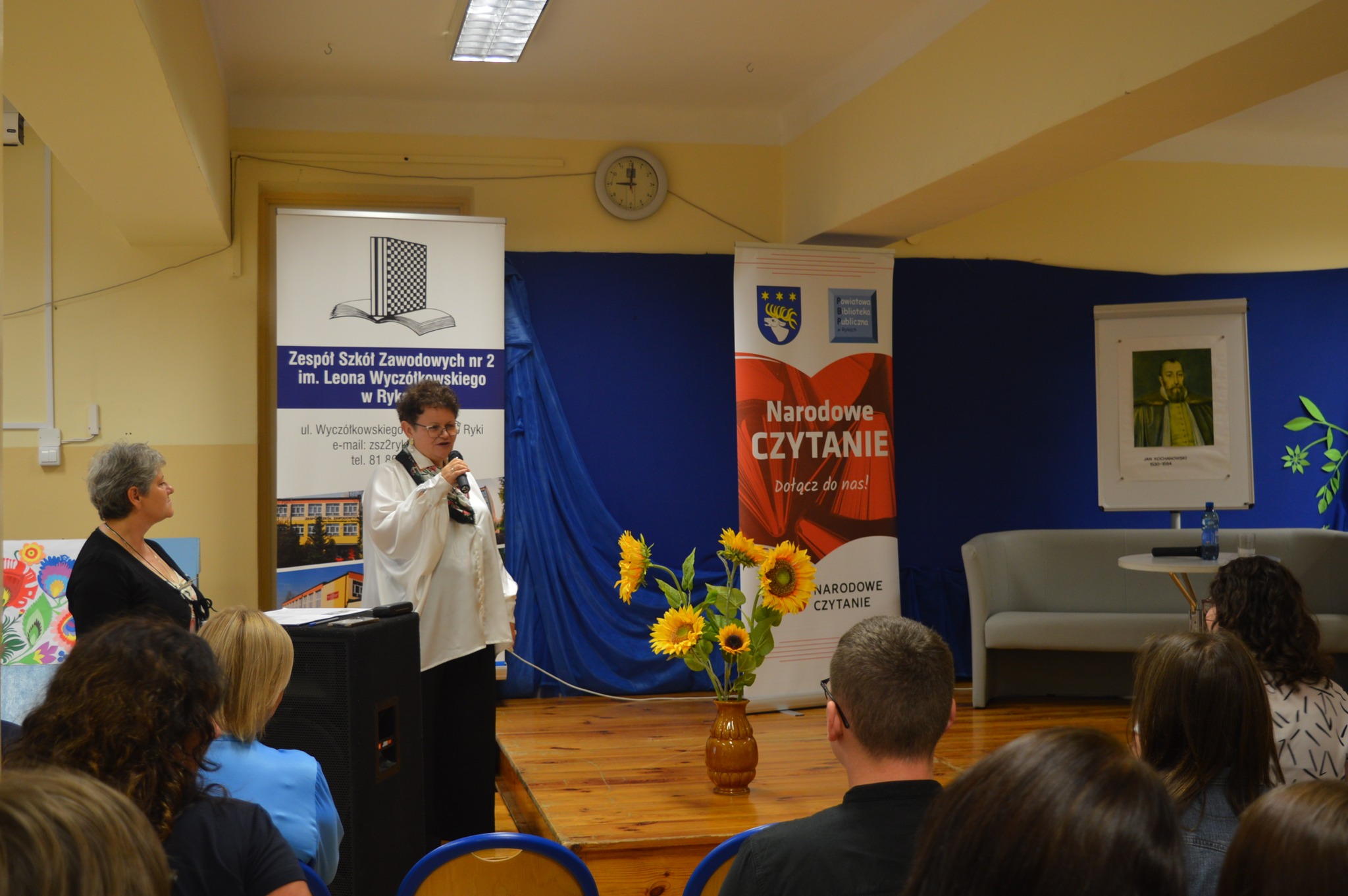 widownia siedzi, słucha, z boku żółte słoneczniki, tło narodowe czytanie, scena