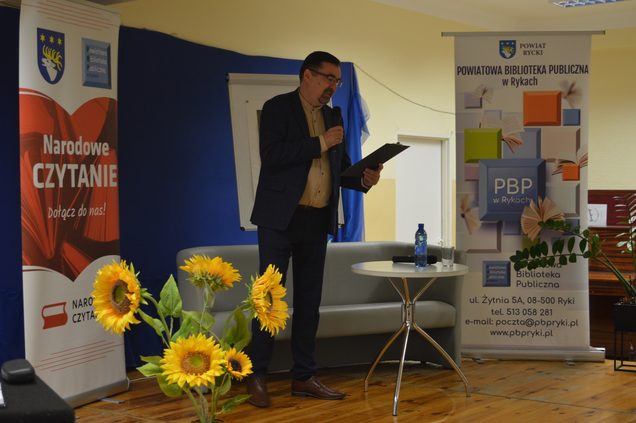 Czyta mężczyzna, czarny garnitur, stoi na scenie z boku żółte słoneczniki, tło narodowe czytanie, scena