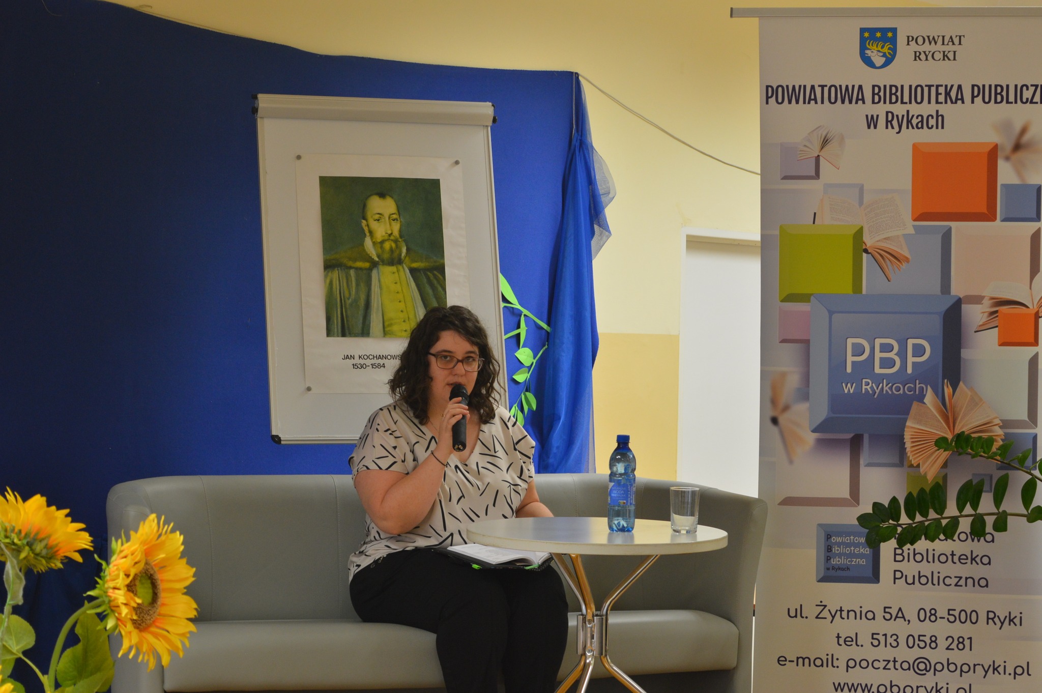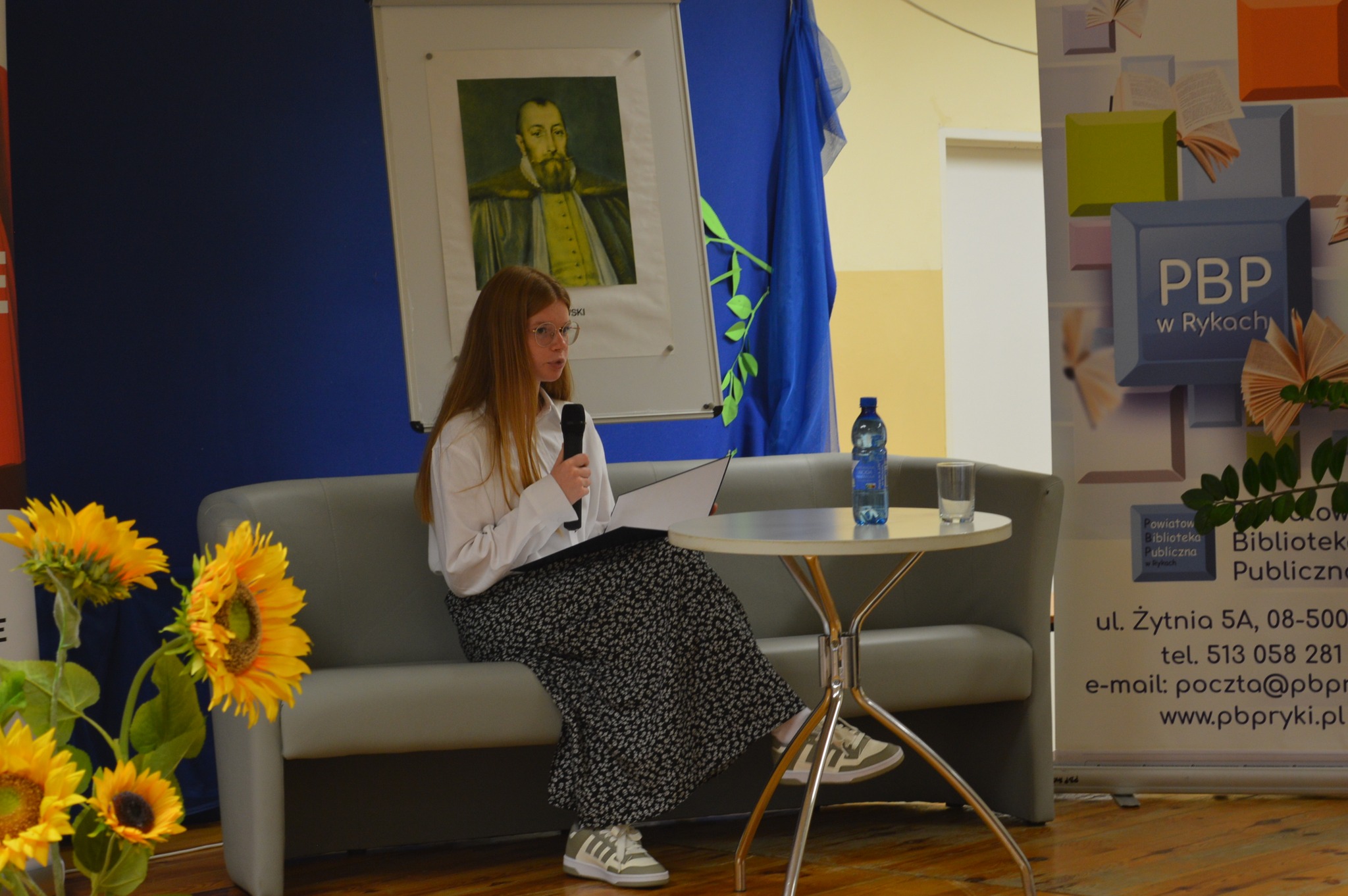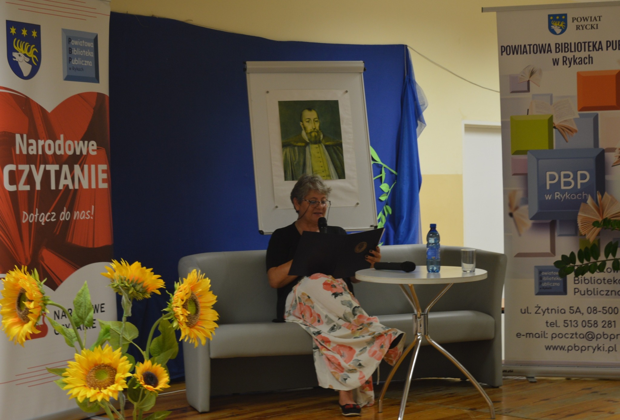 Dyrektor PBP Jarosz Dagmara  siedzi, czyta, z boku żółte słoneczniki, tło narodowe czytanie, scena