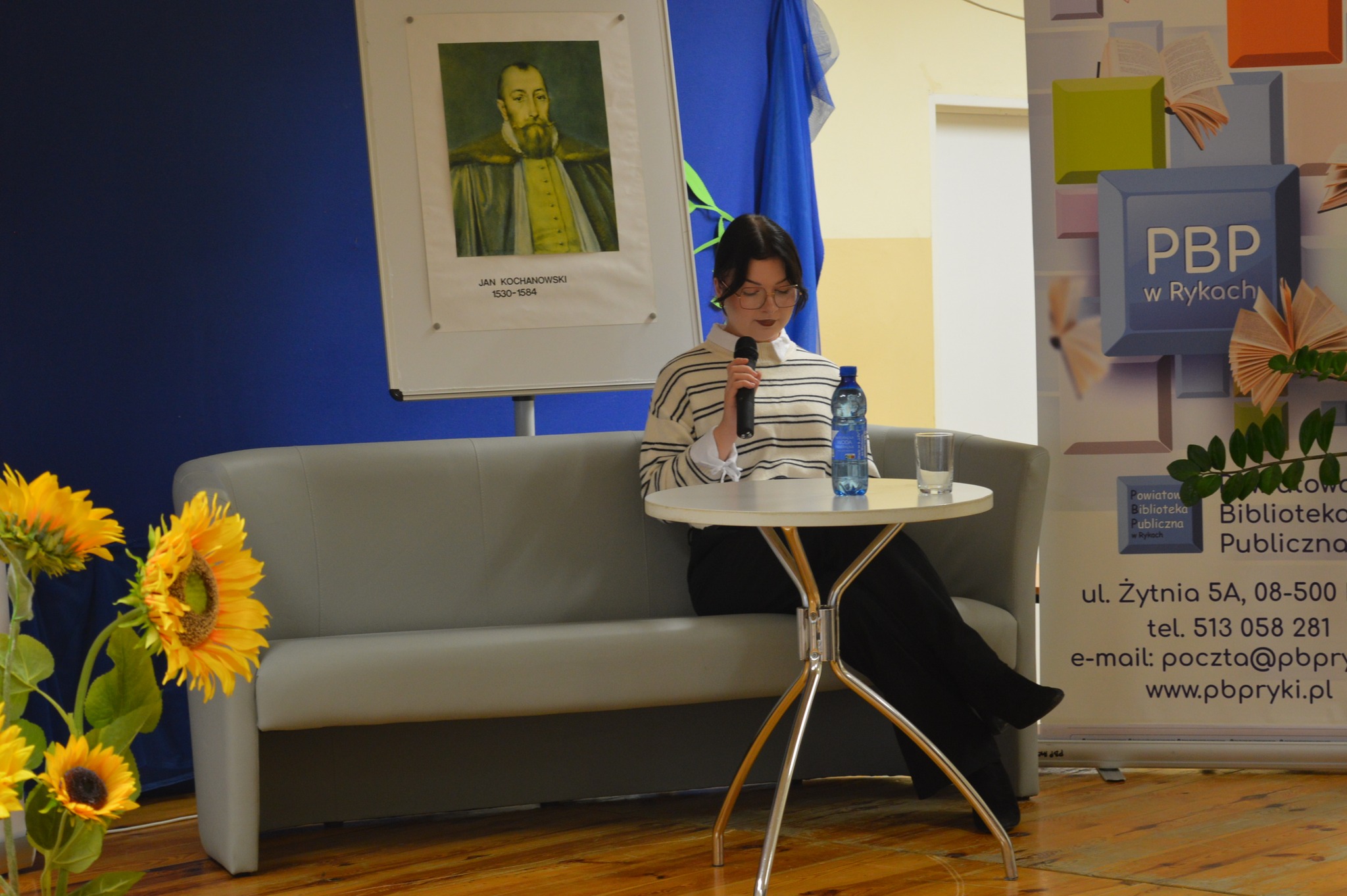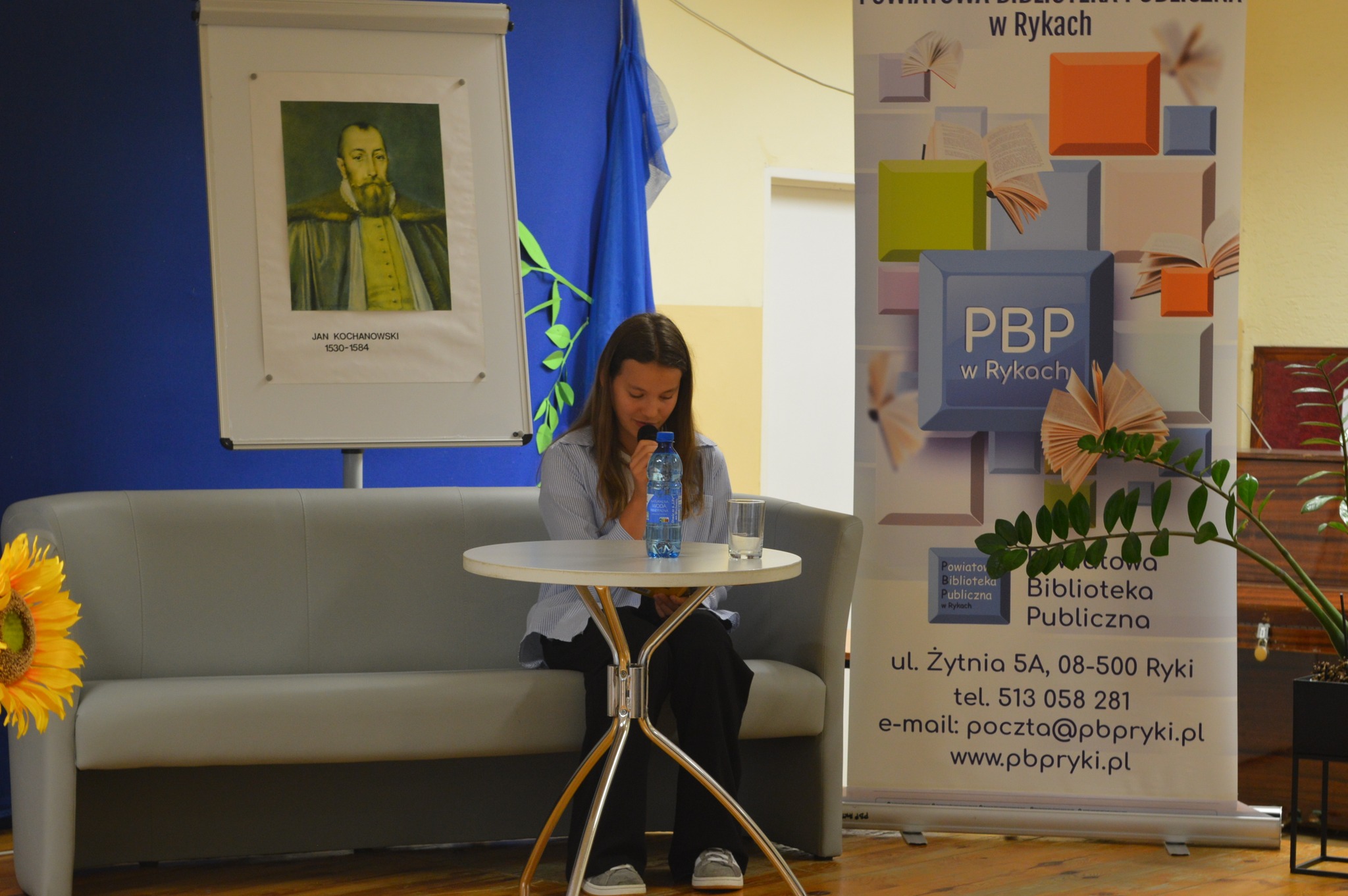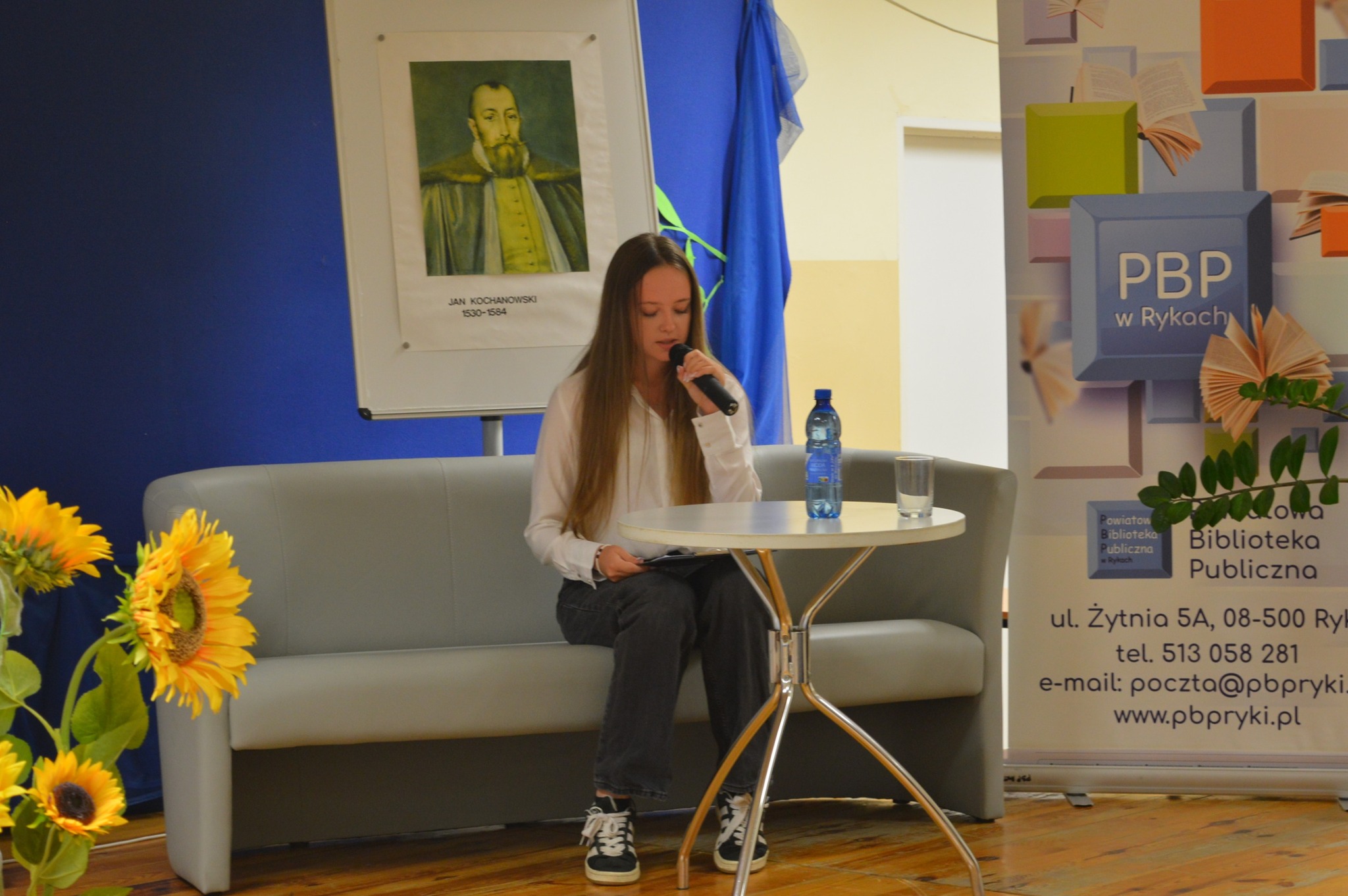 Dyrektor PBP Jarosz Dagmara  siedzi, czyta, z boku żółte słoneczniki, tło narodowe czytanie, scena