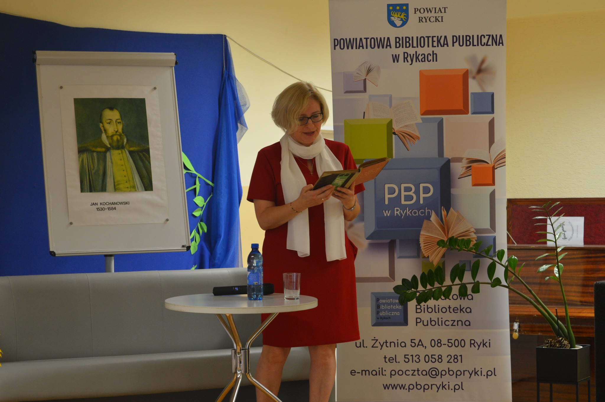 Czyta starosta Monika niebieska bluzka, tło narodowe czytanie, scena