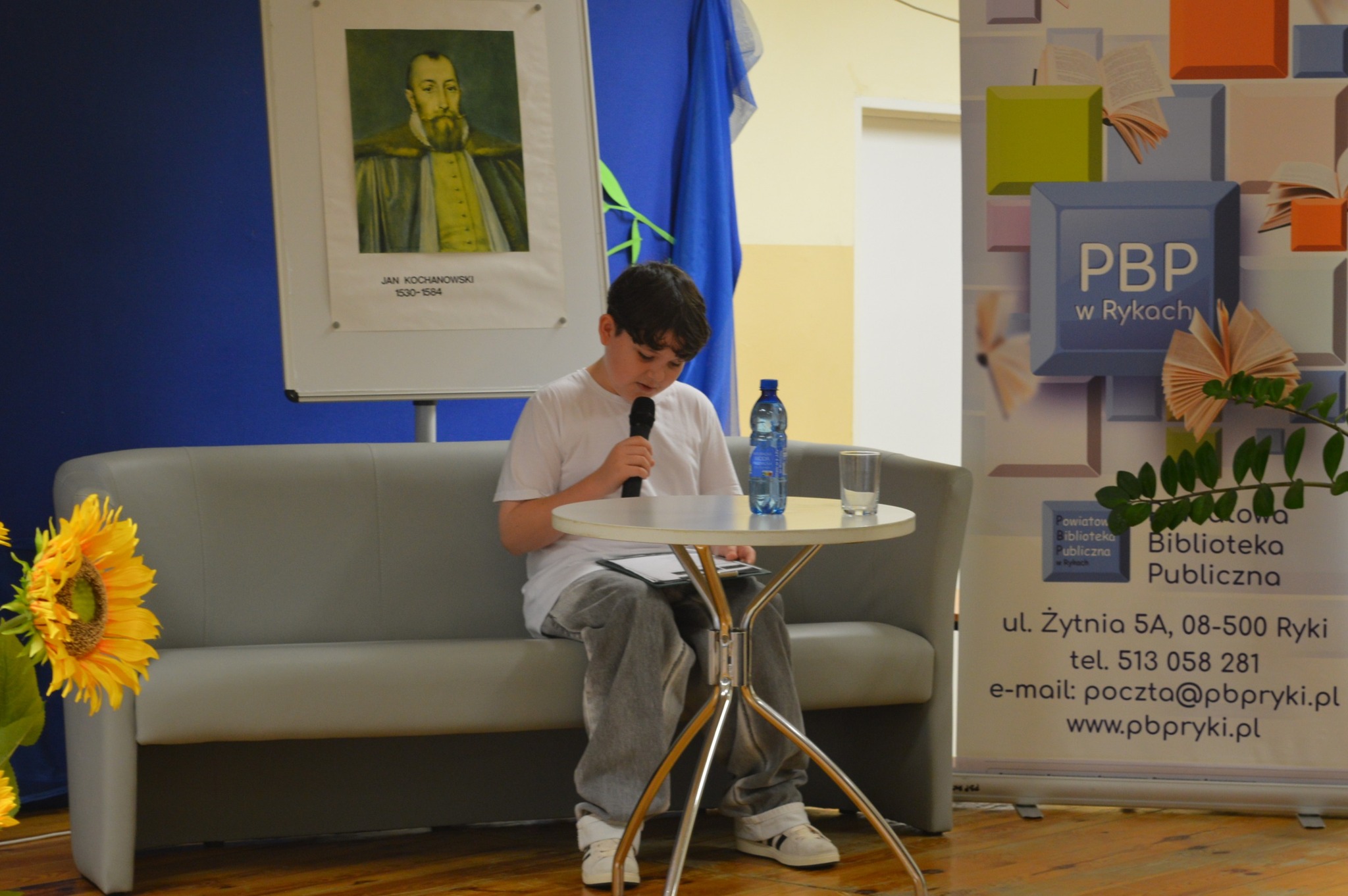 Czyta chłopiec, czarny garnitur, siedzi, na scenie z boku żółte słoneczniki, tło narodowe czytanie, scena