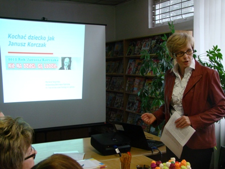 Pierwszym punktem seminarium szkoleniowego było wystąpienie Marzeny Targońskiej z Wojewódzkiej Biblioteki Publicznej w Lublinie poświęcone biografii i działalności Janusza Korczaka. Decyzją Sejmu RP rok 2012 ogłoszono Rokiem Korczakowski dlatego ważne jest, aby tę postać jak najlepiej poznać i jej działalność