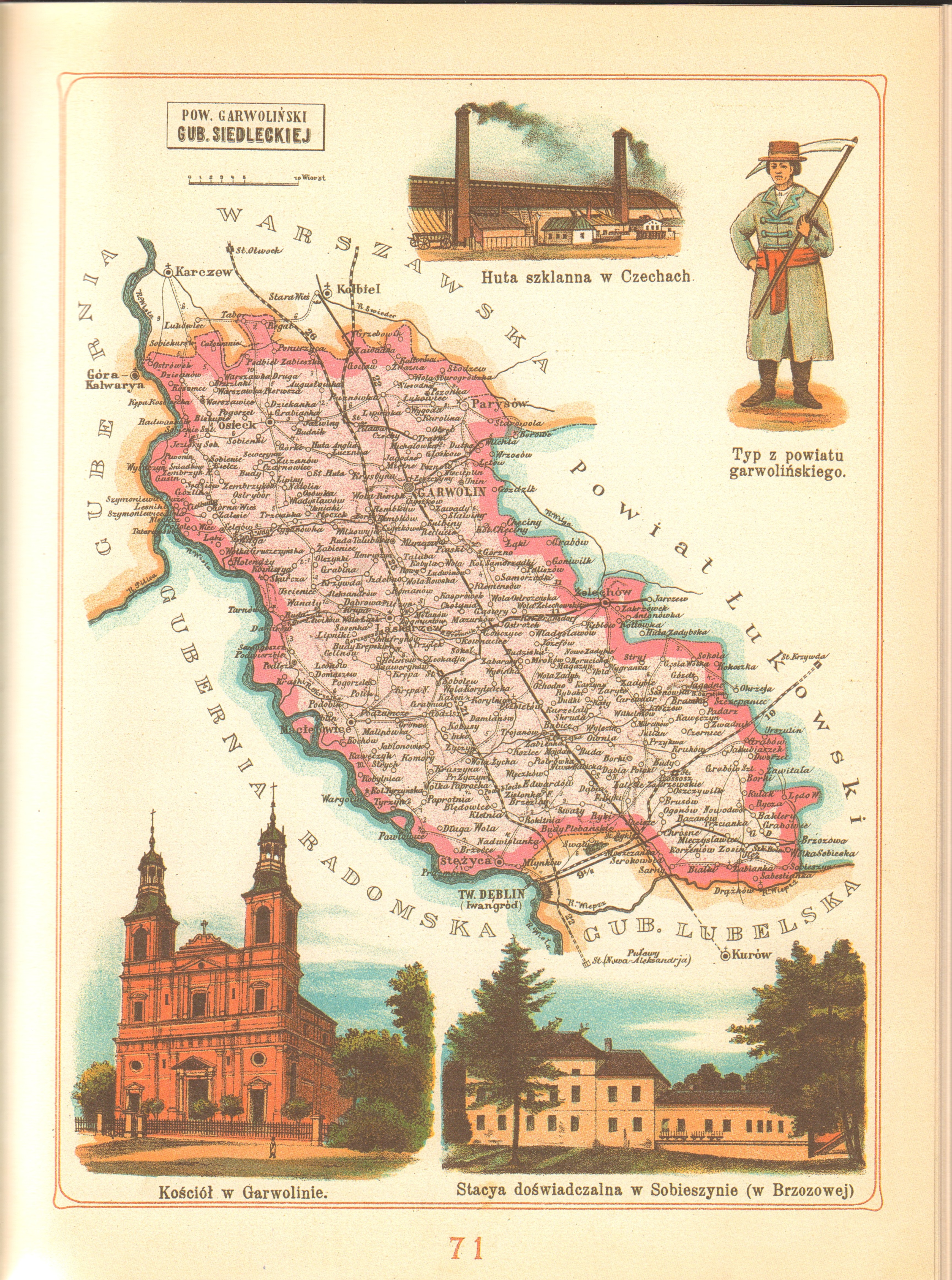 „…powiat garwoliński śmiało możemy nazwać perłą guberni siedleckiej (…) na przestrzeni tej rozłożyło się 9325 osad w 17 gminach (…) na wyróżniające się stanowisko powiatu wpłynęło niezawodnie jego geograficzne położenie (…) ciągnie się on długim pasem, rzuconym nie co pod skosem od północy do południa, na prawym brzegu Wisły, wielkiej drogi komunikacyjnej, a więc cywilizacyjnej; a prócz tego równolegle prawie do Wisły biegnie trakt bity i niedawno zbudowana droga żelazna. Wszystko to miało wpływać korzystnie na stan materyalny i moralny stan mieszkańca. Szkół elementarnych napotykamy tu więcej niż gdzie indziej (…)