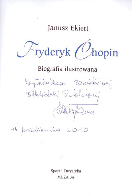 Kulminacyjnym punktem uroczystości było spotkanie zJanuszem Ekiertem autorem książki Fryderyk Chopin biografia ilustrowana, który w niezwykle barwny i obrazowy sposób przedstawił swoją opowieść poświęconą Chopinowi. Gościem honorowym uroczystośc i była również Lidia Grychtołówna- laureatka 4 międzynarodowych konkursów pianistycznych w tym Międzynarodowego Konkursu Chopinowskiego w Warszawie.