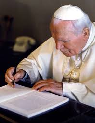 Jan Paweł drugi pochylony nad księgą, dokonuje wpisu