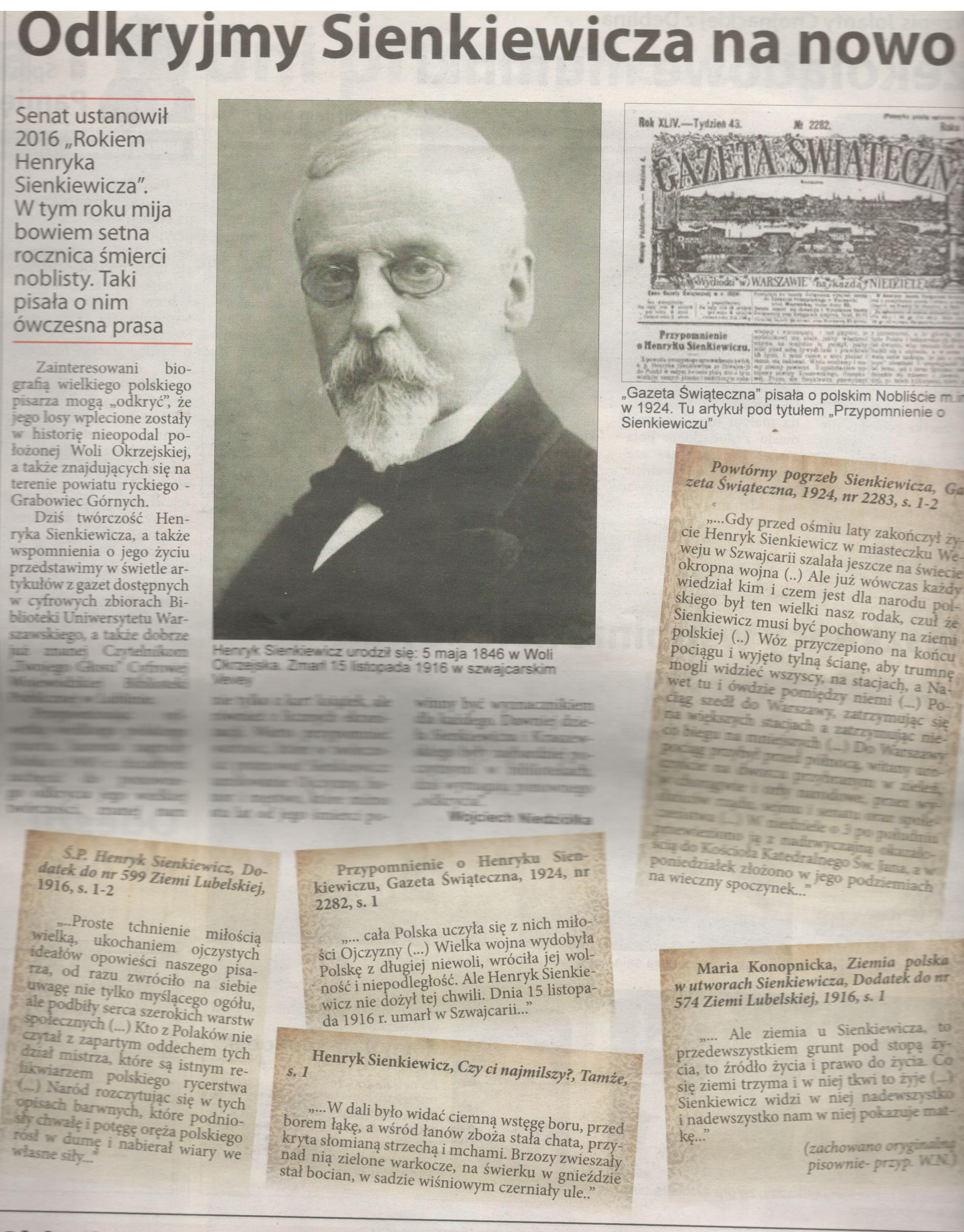 Dziś twórczość Henryka Sienkiewicza przedstawimy w świetle artykułów z gazet dostępnych w cyfrowych zbiorach: Biblioteki Uniwersytetu Warszawskiego, a także dobrze już znanej Czytelnikom Twojego Głosu: Biblioteki Cyfrowej Wojewódzkiej Biblioteki Publicznej w Lublinie.