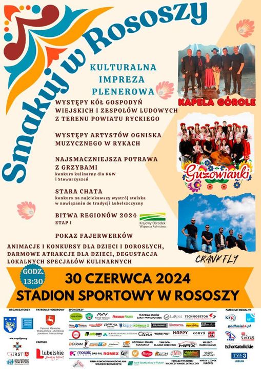 Zapraszamy na kulturalne wydarzenie plenerowe „Smakuj w Rososzy”. Wydarzenie odbędzie się 30 czerwca 2024r. od godz. 13:30 na Stadionie Sportowym w Rososzy. W ramach wydarzenia odbędą się: Konkursy Kół Gospodyń Wiejskich , bezpłatne atrakcje i animacje dla dzieci, degustacja lokalnych specjałów kulinarnych, zabawy i gry sportowe, występy lokalnych zespołów śpiewaczych i KGW oraz uczestników Ogniska Muzycznego w Rykach, także koncert zespołów Crank Fly, Guzowianki oraz Kapela Górole